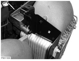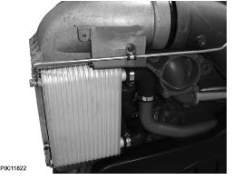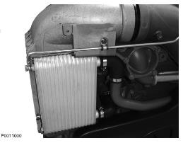 6 拆下固定增壓空氣冷卻器的下部螺母。拆下增壓空氣冷卻器的上部螺釘。將增壓空氣冷卻器沿直線拉出。確保軟管從增壓空氣冷卻器上脫離