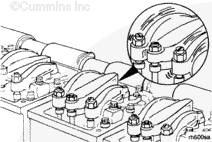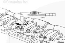 使用度盤式扭矩扳手?jǐn)Q緊噴油器搖臂的調(diào)節(jié)螺釘。如果在調(diào)節(jié)時(shí)引起調(diào)節(jié)螺釘發(fā)出嘎嘎聲,則需要維修調(diào)節(jié)螺釘和搖臂。