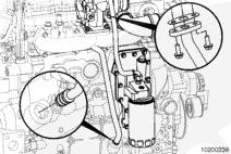 將供油管安裝到渦輪增壓器軸承殼體 (2) 和機油濾清器座 (1) 上。使用新的銅密封墊圈或 O 形密封圈。 注: 擰緊供油管前先用扳手將管接頭固定在機油濾清器座中。如果沒有遵從這個操作,會造成機油濾清器座管接頭擰得過緊。