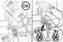 如果萬用表不顯示電壓值,檢查連接啟動(dòng)馬達(dá)電磁閥與蓄電池的電纜是否斷裂。并檢查端子是否松動(dòng)或腐蝕。