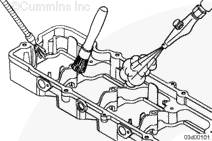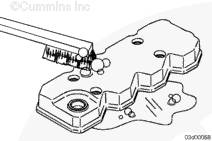 注: 在清潔搖臂室蓋時(shí),如果搖臂密封墊仍然安裝在搖臂室蓋的底座上,不要將搖臂室蓋浸入溶劑中。不要將密封墊過多地進(jìn)入溶劑中。這種可繼續(xù)使用。一旦密封墊從搖臂室蓋上拆下,必須更換。