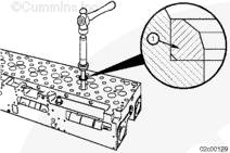 使用氣門導(dǎo)管沖頭(零件號 3163100),安裝新氣門導(dǎo)管。 核實氣門能在氣門導(dǎo)管內(nèi)自由滑動。如果不能,可能需要鉸大導(dǎo)管孔。 參考“清潔和繼續(xù)使用檢查”步驟中的氣門導(dǎo)管內(nèi)徑技術(shù)規(guī)范。 |