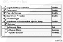 INSITE™ 服務軟件重新與 ECM 連接后,確認“條形碼狀態(tài)”=“設(shè)置”,“更改狀態(tài)”=“成功”。