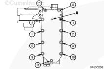 如果機(jī)油冷卻器蓋沒(méi)有凹痕,按所示順序擰緊螺釘。箭頭 (A) 指向凹痕的位置。