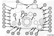 注: 前蓋上有一些螺栓,這些螺栓向上穿透康明斯QSK78發(fā)動(dòng)機(jī)油底殼連接件,穿入康明斯QSK78柴油機(jī)齒輪室蓋。