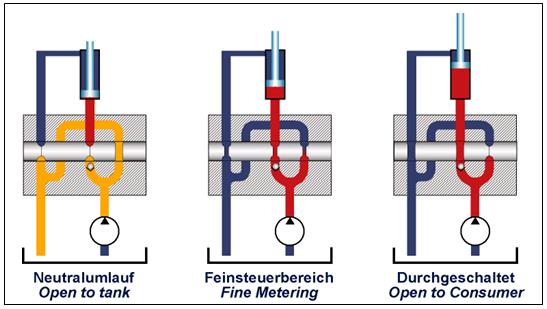 以上所述的工作原理同樣適用于幾個(gè)閥桿,根據(jù)液壓泵提供有效流量,所有操作能從停止到最大速度相應(yīng)并行地受到控制。