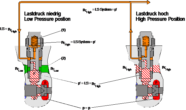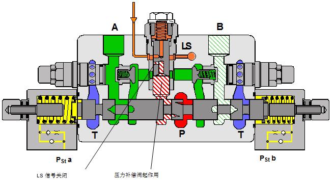 典型的例子就是動(dòng)臂的提升和鏟斗的同步動(dòng)作,動(dòng)臂回路中更高的負(fù)載壓力使得鏟斗部分的壓力補(bǔ)償閥中的節(jié)流口通流面積減少,在這種控制狀態(tài)下,壓力補(bǔ)償閥的控制端產(chǎn)生一個(gè)從P‘通道到執(zhí)行機(jī)構(gòu)端口Pc的壓降,通過測流節(jié)流口 (7)的Dp是相同的。因此,執(zhí)行機(jī)構(gòu)的速度與負(fù)載壓力的差別無關(guān)。