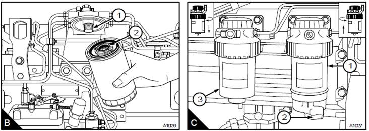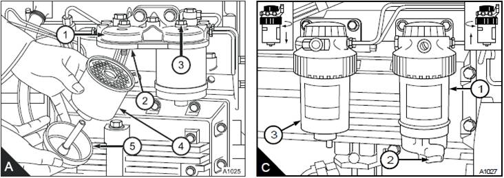 裝配快卸式濾罐(C)的燃油濾清器。濾清器可有兩個(gè)濾罐。一些發(fā)動(dòng)機(jī)裝配有同類型的粗濾器(C1)。此濾清器安裝在主濾清器(C3)旁邊,在燃油系統(tǒng)中連接在燃油輸油泵前。