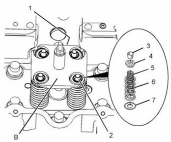 4. 安裝內(nèi)部氣門彈簧 (5) 和外部氣門彈簧(6).