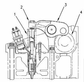 電子單體噴油器機(jī)構(gòu)提供給電子單體噴油器泵中的燃油加壓所需的向下力。電子單體噴油器(1)允許燃油以精確的正時(shí)噴射到燃燒室中。運(yùn)動(dòng)通過搖臂總成(3)從電子單體噴油器的凸輪軸凸輪(4)傳輸?shù)诫娮訂误w噴油器的頂部。調(diào)整螺母(2)允許調(diào)整噴油器間隙。有關(guān)噴油器間隙的正確設(shè)置,請(qǐng)參閱系統(tǒng)操作、測(cè)試和調(diào)整中有關(guān)電子單體噴油器調(diào)整的主題“電子單體噴油器-調(diào)整”。