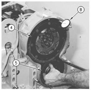 4. 將工具(B)安裝到正時齒輪殼體上。將惰輪總成(5)松裝到正時齒輪殼體上。當惰輪總成(5)保持靜止時,凸輪軸齒輪(4)和惰輪齒輪(5)之間的齒隙為0.216±0.114 mm(0.0085±0.0045 in)。