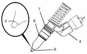 3. 確保CAT卡特C13珀金斯2206柴油機(jī)電子單體噴油器(4)上的座椅區(qū)域(X)清潔且無(wú)碳。