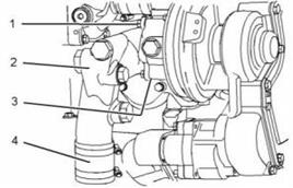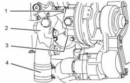 8. 將新的O形密封圈(3)(未顯示)安裝到水泵上。定位連接(2)并安裝螺栓(1)。將螺栓擰緊至28 N•m(21 lb ft)的扭矩。