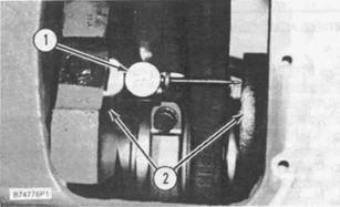 3. 安裝一個STARRETT NO.696曲軸變形千分表,STARRETT NO.696B平衡附件要位于如圖所示的平衡重之間。將千分表(1)放置在平衡重上表面(2)上方6.4毫米(0.25英寸)范圍內(nèi)。轉(zhuǎn)動指示器的度盤使零刻度與指針對準(zhǔn)。從指示器的末端轉(zhuǎn)動指示器直到指示器的指針不會從零刻度移開。