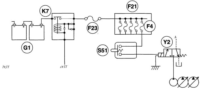 發(fā)動機(jī)啟動后并且安全桿開關(guān)處于工作狀態(tài)時,先導(dǎo)壓力電磁閥(Y2)啟動。