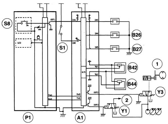 回轉(zhuǎn)制動(dòng)開關(guān)(S8)關(guān)閉(二極管紅光消失)時(shí),回轉(zhuǎn)制動(dòng)(1)關(guān)閉,回轉(zhuǎn)制動(dòng)自動(dòng)檢查啟動(dòng)(參見圖4)