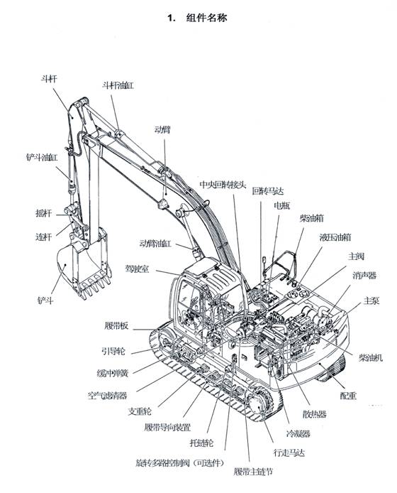 單斗液壓挖掘機(jī)的總體結(jié)構(gòu)包括動(dòng)力裝置、工作裝置、回轉(zhuǎn)機(jī)構(gòu)、操縱機(jī)構(gòu)、傳動(dòng)系統(tǒng)、行走機(jī)構(gòu)和輔助設(shè)備等,如圖1-1所示。常用的全回轉(zhuǎn)式液壓挖掘機(jī)的動(dòng)力裝置、傳動(dòng)系統(tǒng)的主要部分、回轉(zhuǎn)機(jī)構(gòu)、輔助設(shè)備和駕駛室等都安裝在可回轉(zhuǎn)的平臺(tái)上,通常稱為上部轉(zhuǎn)臺(tái)。因此又可將單斗液壓挖掘機(jī)概括成工作裝置、上部轉(zhuǎn)臺(tái)和行走機(jī)構(gòu)等三部分。