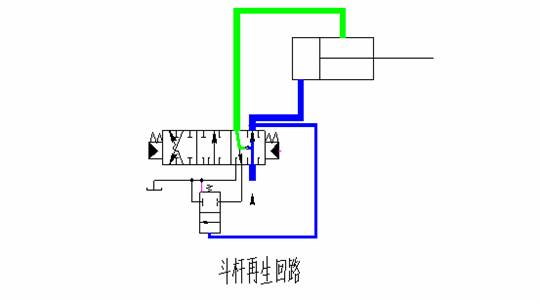 斗桿再生回路,當(dāng)斗桿無負(fù)載下落時,為提高斗桿運行速成度,在斗桿油缸伸出時,把活塞桿腔的油引回大腔,實現(xiàn)再生功能