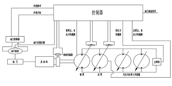 該系統(tǒng)由恒功率泵、模式閥組(功率閥)、發(fā)動(dòng)機(jī)轉(zhuǎn)速傳感器、油門位置傳感器、 控制器、顯示屏及5個(gè)壓力傳感器組成。發(fā)動(dòng)機(jī)轉(zhuǎn)速傳感器為電磁感應(yīng)式,他固定在飛輪殼的上方,用以檢測(cè)發(fā)動(dòng)機(jī)的實(shí)際轉(zhuǎn)速。油門位置傳感器為電阻感應(yīng)式,他固定在油門機(jī)構(gòu)轉(zhuǎn)盤上,用以檢測(cè)油門的實(shí)際位置。通過(guò)5個(gè)壓力傳感器測(cè)得的工裝實(shí)時(shí)負(fù)荷大小,由控制器程序計(jì)算液壓泵的需求功率,從而自動(dòng)調(diào)節(jié)功率閥電流,實(shí)現(xiàn)液壓泵的功率調(diào)節(jié),使液壓系統(tǒng)充分吸收柴油機(jī)發(fā)出的功率,又不會(huì)使柴油機(jī)熄火,充分發(fā)揮挖掘機(jī)的工作能力。