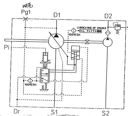 下圖是泵的原理圖,該泵組由一個(gè)負(fù)荷傳感泵和一個(gè)先導(dǎo)控制泵組成。