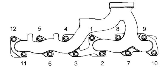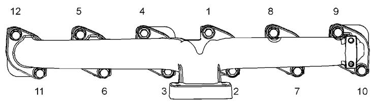 頂部安裝式渦輪增壓器的排氣歧管按照圖 20 中所示順序依次將排氣歧管螺栓擰緊至以下扭矩。 44 N•m (32 lb ft)側(cè)裝式渦輪增壓器的排氣歧管