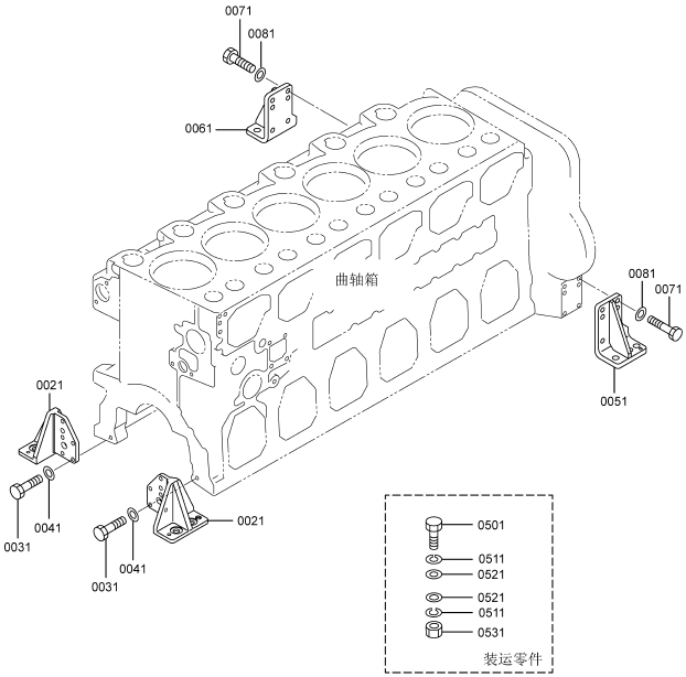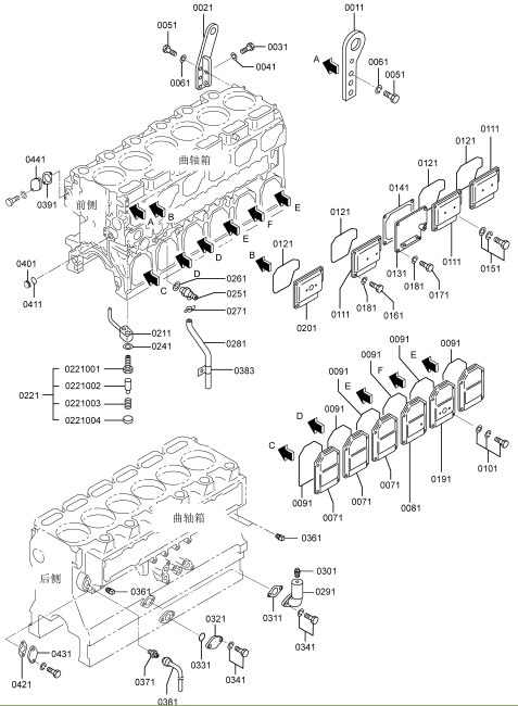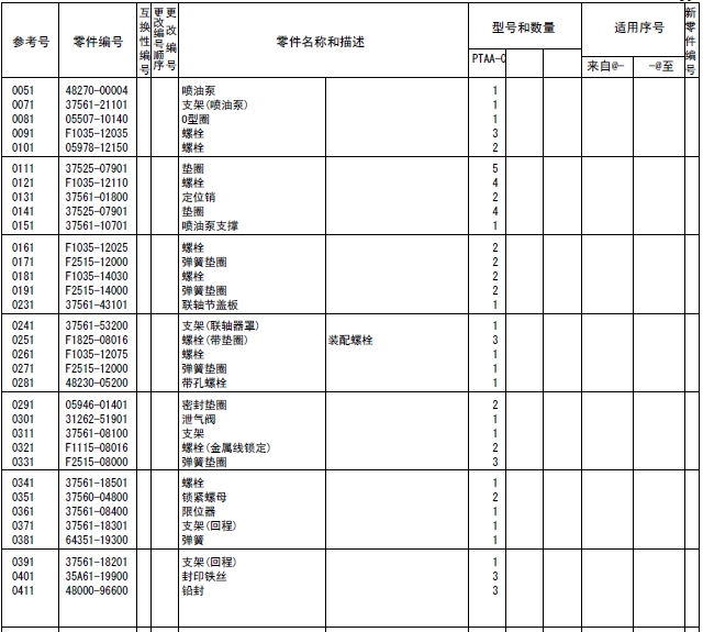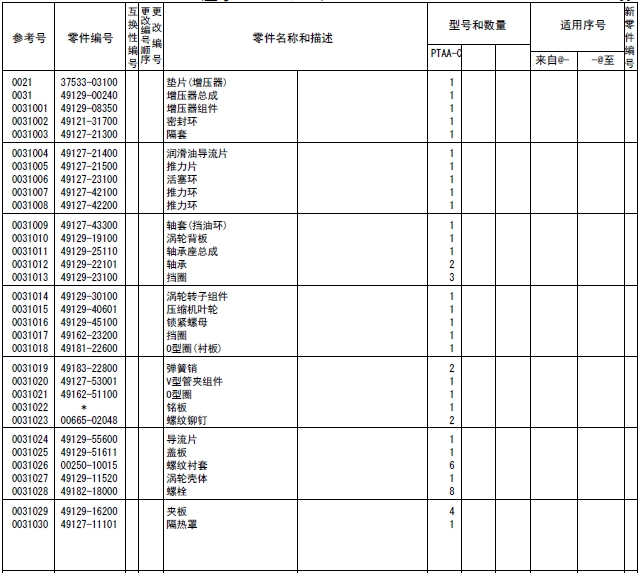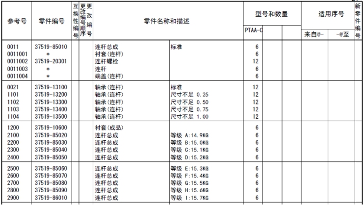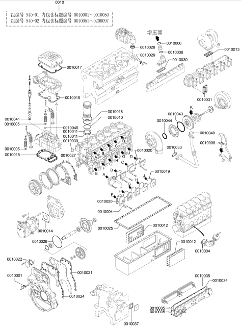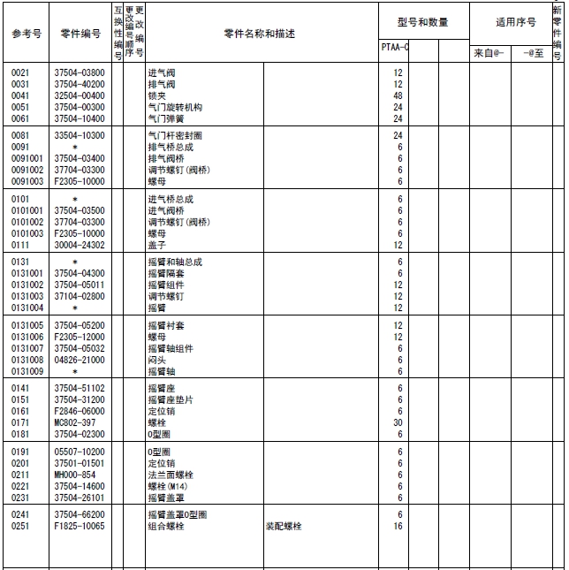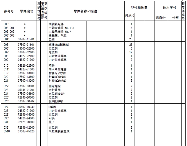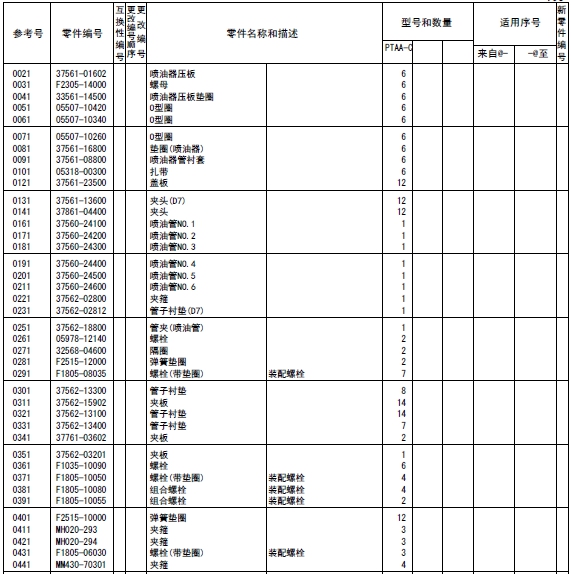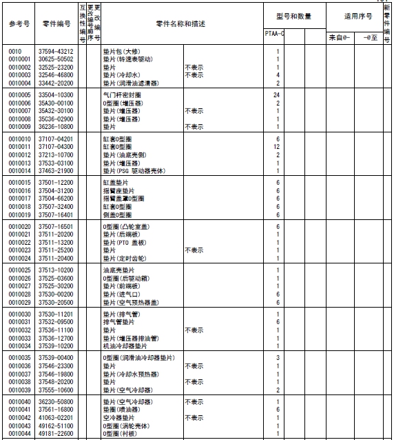 37519-85010連桿總成標(biāo)準(zhǔn),襯套(連桿),37519-20301連桿螺栓,連桿,端蓋(連桿),37519-13100軸承(連桿)標(biāo)準(zhǔn),37519-13200軸承(連桿)尺寸不足0.25,37519-13300軸承(連桿)尺寸不足0.50,37519-13400軸承(連桿)尺寸不足0.75,37519-13500軸承(連桿)尺寸不足1.00,37519-10600襯套(成品),37519-85020連桿總成等級(jí)A:14.9KG,37519-85030連桿總成,37519-85040連桿總成,37519-85050連桿總成,37519-85060連桿總成,37519-85070連桿總成,37519-85080連桿總成,37519-85090連桿總成,37519-86010連桿總成,37520-25013曲軸總成,曲軸組件,曲軸,37523-00101曲軸齒輪擋位數(shù)60,F2846-05000定位銷,F2846-20000定位銷,F1035-22080螺栓,33707-11701墊圈,37521-00013飛輪組件,32521-02201齒圈擋位數(shù),飛輪,37523-13012惰齒輪總成擋位數(shù)80&40,37123-03400風(fēng)扇襯套,惰齒輪,37523-13504惰輪軸,F1035-12030螺栓,37525-07901墊圈,32423-03800墊板,F1035-10025螺栓,34A48-02100墊圈,37523-11100凸輪軸齒輪擋位數(shù)60,37523-12101噴油泵齒輪擋位數(shù)60,37525-70100前端板,37525-30200墊片(前端板),F1805-12035螺栓(帶墊圈)裝配螺栓,F1805-12040螺栓(帶墊圈)裝配螺栓,F1035-12045螺栓,F2515-12000彈簧墊圈,F2846-14000定位銷,37525-04001油封總成(前側(cè)),37425-08201前甩油盤,37511-04300油封,37525-12201皮帶輪(曲軸),F1035-22100螺栓,33707-11701墊圈,05507-20900O型圈,47501-21200皮帶罩,R.H,47502-27201皮帶罩L.H,37525-63100傳動(dòng)軸殼體,37525-03600O型圈,F1035-12045螺栓,37525-07901墊圈,F1035-12035螺栓,37525-07901墊圈,37525-24200油泵傳動(dòng)軸,37725-15700平鍵,F2870-10032半圓鍵,37525-00600墊圈,37525-09900螺母,F8010-06309球軸承,F3202-10000擋圈,F8006-06210球軸承,37525-13400油封,04827-71300內(nèi)六角錐螺塞,47220-46401空氣濾清器,47220-38802濾芯組件,47220-34401指示器,47220-38300扎帶,47220-30400彎頭,45735-73400橡膠管,47221-17500軟管(空氣),47501-72500空氣管,37533-03100墊片(增壓器),49129-00240增壓器總成,49129-08350增壓器組件,49121-31700密封環(huán),49127-21300隔套,49127-21400潤滑油導(dǎo)流片,49127-21500推力片,49127-23100活塞環(huán),49127-42100推力環(huán),49127-42200推力環(huán),49127-43300軸套(擋油環(huán)),49129-19100渦輪背板,49129-25110軸承座總成,49129-22101軸承,49129-23100擋圈,49129-30100渦輪轉(zhuǎn)子組件,49129-40601壓縮機(jī)葉輪,49129-45100鎖緊螺母,49162-23200擋圈,49181-22600O型圈(襯板),49183-22800彈簧銷,49127-53001V型管夾組件,49162-51100O型圈,銘板,00665-02048螺紋鉚釘,49129-55600導(dǎo)流片,49129-51611蓋板,00250-10015螺紋襯套,49129-11520渦輪殼體,49182-18000螺栓,49129-16200夾板,49127-11101隔熱罩,37535-70010潤滑油泵總成,37536-50100機(jī)油吸油管,F1035-10080螺栓,F2515-10000彈簧墊圈,05507-20650O型圈,37536-01200支架(潤滑油管),37536-34020釋放閥總成,37536-22401機(jī)油管,F2005-12025螺栓(帶墊圈)裝配螺栓,F4610-16000帶孔螺栓,05946-01601密封墊圈,37536-52500回油管,F2005-10025螺栓(帶墊圈)裝配螺栓,F1805-12025螺栓(帶墊圈)裝配螺栓,37536-12700機(jī)油墊片,35C36-02900墊片,05507-20300O型圈,F1155-10040螺栓,F2515-10000彈簧墊圈,37536-33100潤滑油管R.H,F1805-10020螺栓(帶墊圈)裝配螺栓,37536-43300回油管,F4610-12000帶孔螺栓,05946-01201密封墊圈,F4610-14000帶孔螺栓,05946-01401密封墊圈,37736-09500支架(潤滑油管),F1805-10020螺栓(帶墊圈)裝配螺栓,37539-40010油冷器總成,37539-20100油冷器芯子,37539-30300外殼,F5006-10000錐形塞,F5006-13000錐形塞,ME064-526防塵塞,MH035-092O型圈,MH035-093O型圈,MH035-626O型圈,ME150-442凸緣螺母,37539-10200機(jī)油冷卻器墊片,37539-00400O型圈,F1825-12035螺栓(帶墊圈)裝配螺栓,F1825-12030螺栓(帶墊圈)裝配螺栓,37539-10500恒溫器(潤滑油),37539-00600節(jié)溫器密封墊,37540-20010潤滑油濾清器總成,37540-02100濾筒(潤滑油旁通濾清器),37540-10100支架組件,37540-11100機(jī)油濾清器芯子,錐形塞,F1035-12110螺栓,F1825-12045螺栓(帶墊圈)裝配螺栓,30068-22400螺栓,F2515-12000彈簧墊圈,F2500-12000平墊圈,05507-20400O型圈,05507-10180O型圈,05507-20750O型圈,37540-01301油濾報(bào)警器,37543-10020呼吸器總成,37543-10100呼吸器,37545-80011水泵總成,37545-01400油封,F3153-09500O型圈,05507-10150O型圈,05507-20250O型圈,F1805-12030螺栓(帶墊圈)裝配螺栓,F1805-12050組合螺栓裝配螺栓,37549-06590V型皮帶寬度22.8L=1535,37549-06480V型皮帶寬度22.8L=1250,37545-18010張緊輪總成,35A45-01401球軸承,35A45-01501隔圈,35A45-02100推力片,35A45-02200隔圈,35A45-11302張緊輪,37545-18300張緊支架,F1035-12025螺栓,F2515-12000彈簧墊圈,F3202-05200擋圈,37545-08201張緊板,37545-18400滑板,37545-08600張緊螺栓,F2305-12000螺母,F1805-10030螺栓(帶墊圈)裝配螺栓,F1035-14030螺栓,F2515-14000彈簧墊圈,37546-21101接頭,05505-31065O型圈,05505-57060O型圈,37546-21201蓋板,F1825-10030螺栓(帶墊圈)裝配螺栓,37546-11300擋圈,37546-21701恒溫器,37546-01800節(jié)溫器密封墊,37546-00900擋圈,恒溫器總成,37546-23702節(jié)溫器座,F5006-10000內(nèi)六角錐螺塞,36646-00090微動(dòng)閥總成,37546-23201節(jié)溫器蓋板,37546-23300節(jié)溫器蓋板墊片,F1805-10030螺栓(帶墊圈)裝配螺栓,37546-23402支架(恒溫器殼體),37547-03700支承(恒溫器支架),F2515-08000彈簧墊圈,F1035-08020螺栓,F1805-10025螺栓(帶墊圈)裝配螺栓,F1035-10030螺栓,F2515-10000彈簧墊圈,F1805-12030螺栓(帶墊圈)裝配螺栓,37546-15200旁通管,37546-04400支架(旁通管),F1805-12025螺栓(帶墊圈)裝配螺栓,32546-46800空冷器墊片,33546-06900蓋板,F1805-12030組合螺栓裝配螺栓,F3153-06000O型圈,F1805-10030螺栓(帶墊圈)裝配螺栓,37546-03500蓋板,37546-14600橡膠管,05317-50701夾箍,F5006-21000錐