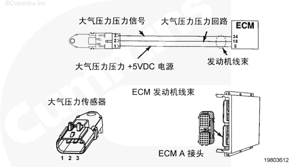 大氣壓力傳感器通過康明斯QSK78發(fā)動機(jī)線束向 CM500 ECM 提供大氣壓力信號。CM500 ECM 利用大氣壓力傳感器根據(jù)海拔調(diào)節(jié)供油。