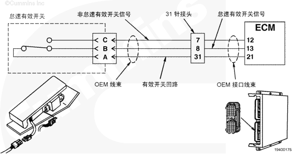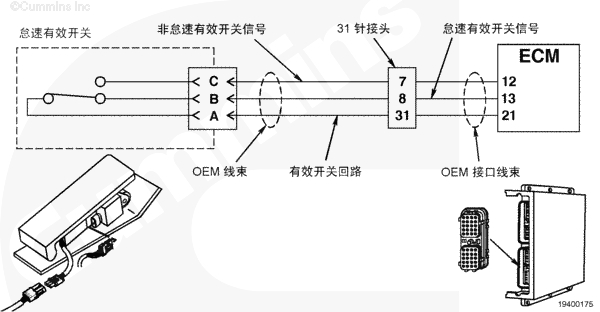 怠速有效信號在 CM500 ECM 檢測到不正確的有效信號時禁用油門控制,這是一個安全特性。怠速有效開關(guān)通過 OEM 線束和 OEM 接口線束向 CM500 ECM 提供怠速和非怠速有效信號。