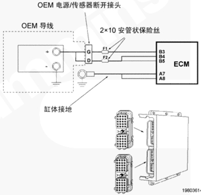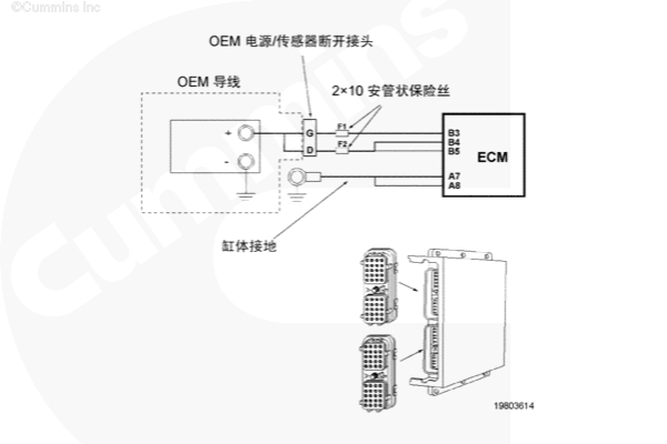 CM500 ECM 通過 OEM 線束和康明斯QSK78發(fā)動機(jī)線束接收無開關(guān)蓄電池電壓。OEM 接口線束的無開關(guān)蓄電池導(dǎo)線中有兩個個串聯(lián)式 10 安培保險絲,以保護(hù) CM500 ECM。康明斯QSK78發(fā)動機(jī)線束中的蓄電池回路導(dǎo)線連至康明斯QSK78發(fā)動機(jī)缸體接地。