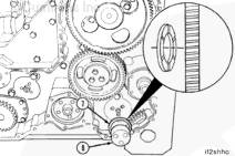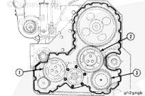 拆卸惰輪之前,使用附件驅(qū)動(dòng)軸轉(zhuǎn)動(dòng)曲軸,直到曲軸齒輪 (1)、凸輪軸齒輪 (2) 和附件驅(qū)動(dòng)齒輪 (3) 上的正時(shí)標(biāo)記完全與凸輪軸惰輪嚙合。