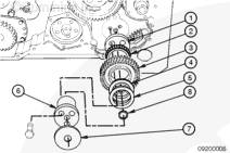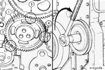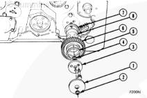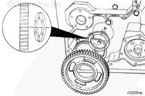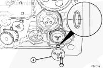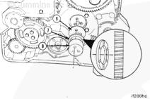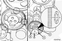 對(duì)正正時(shí)標(biāo)記并安裝惰輪 (6)、前止推軸承 (5) 和齒輪擋圈 (4)。安裝并擰緊固定螺栓。