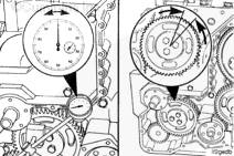 以下惰輪軸向間隙和側(cè)隙檢查適用于所有的 3 個(gè)惰輪。同樣的 最小和最大值也適用。用帶有磁性基座的千分表測(cè)量惰輪的軸向間隙。讓千分表的觸頭頂著惰輪表面。惰輪軸向間隙