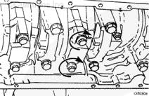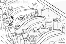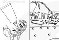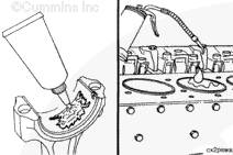 使用 2 mm [0.0625 in] 珠嘴密封膠沿著油底殼螺栓孔滴在加強(qiáng)板與缸體接觸區(qū)域。