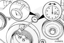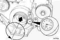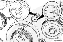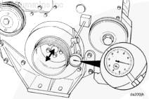 將帶有磁性底座的千分表(零件號(hào)3376050)和加長(zhǎng)桿(零件號(hào)ST-537-4),安裝到缸蓋或減震器的前部。將千分表的測(cè)頭穿過(guò)齒輪室蓋檢修孔,置于凸輪軸齒輪的表面。將千分表歸零。