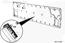 除去缸體配合面上所有的密封膠材料和機(jī)油。徹底清潔缸體螺紋螺栓孔。從加強(qiáng)板上清除所有的密封墊和密封膠材料。用溶劑徹底清潔加強(qiáng)板兩面的機(jī)油。