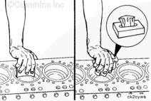 將安裝工具夾板 (1) 穿過(guò)缸套,安裝兩個(gè)缸蓋螺栓,用手指擰緊以固定夾板。旋轉(zhuǎn)壓板,直到突出量待測(cè)區(qū)域露出。