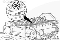 安裝凸輪軸惰輪 (1) 時(shí),確保曲軸齒輪 (2) 上的正時(shí)標(biāo)記 “0”、凸輪軸齒輪 (3) 上的正時(shí)標(biāo)記 “X” 以及附件驅(qū)動(dòng)齒輪 (4) 上的正時(shí)標(biāo)記 “V” 如圖示那樣對(duì)正。