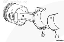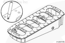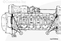 將四顆長(zhǎng)度為 10 cm [4 in] 的導(dǎo)向銷(1 和 2)間隔均勻安裝到缸體油底殼螺栓孔中。這些導(dǎo)向銷可輔助加強(qiáng)板和油底殼組裝。