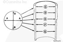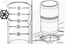 在點(diǎn)“C”、“D”、“E”、“F”和“G”處測(cè)量缸套孔失圓度,測(cè)量每個(gè)點(diǎn)時(shí)在“AA”和“BB”方向進(jìn)行測(cè)量。缸套孔 失圓度不得超過(guò) 0.10 mm [0.004 in]。