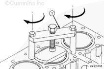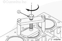 使用缸套壓緊工具(零件號(hào) 3824272)將缸套座入缸體。將壓板 (3) 穿過(guò)缸套頂部,使壓板臺(tái)階放在缸套孔內(nèi)。