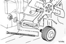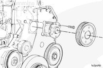 拆下水泵皮帶輪固定螺栓。使用標(biāo)準(zhǔn)皮帶輪拉拔器(零件號 ST-647)或等效物和兩顆 5/16 x 18-2 螺栓拆卸皮帶輪。