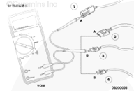 檢查以確保線路中沒有開路,則 必須檢查導(dǎo)線線束中下列觸針之間的導(dǎo)通性:風(fēng)扇離合器接頭 (1) 的觸針 B 與接地端子 (2)